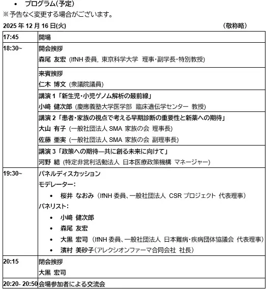 本シンポジウムでは、「新生児・小児への希望 遺伝性難病に対するゲノム検査と最先端治療」をテーマに、患者・ご家族、医師、シンクタンク、製薬企業など、多様な立場の登壇者による講演・討論を行います。本シンポジウムを通じて、遺伝性難病の早期診断等に関する最新の知見や医療現場での取り組み、政策動向等について聴講者の皆様に理解を深めていただけます。