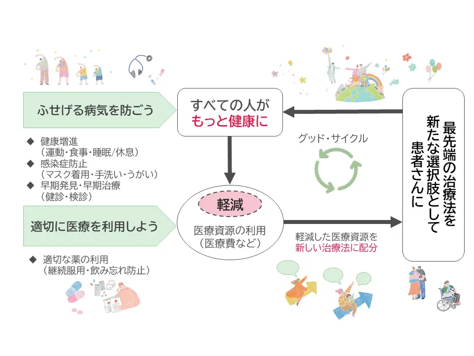 私たち一人ひとりが健康でいることで、医療資源を有効に活用することができ、それが最先端の治療を必要とする患者さんを助けることができる社会の実現に繋がります。